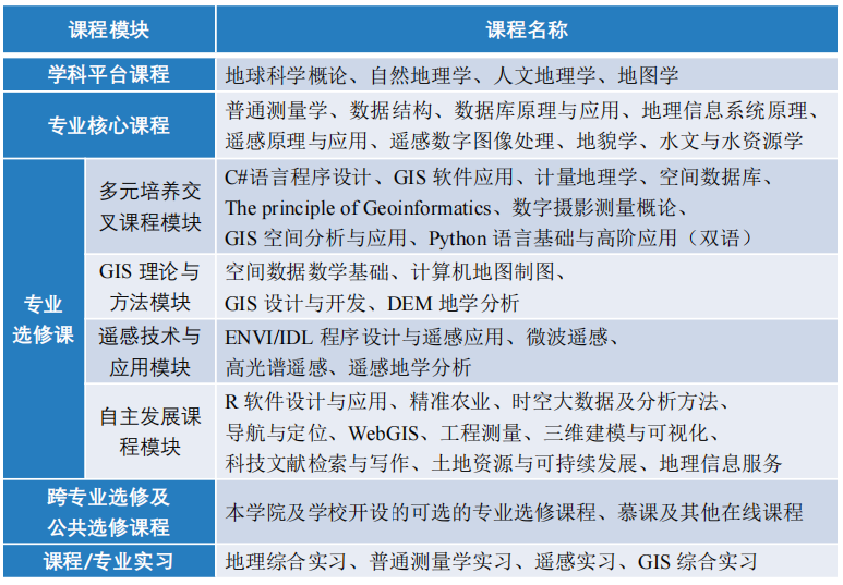 地理信息科学专业围绕现代地理学、现代测量学、现代地图学、遥感、地理信息科学等,开设了学科平台课、专业核心课、专业选修课、跨专业选修课等多层次课程30余门。