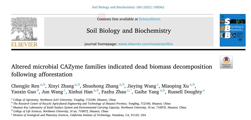 【论文题目】Altered microbial CAZyme families indicated dead biomass decomposition following afforestation