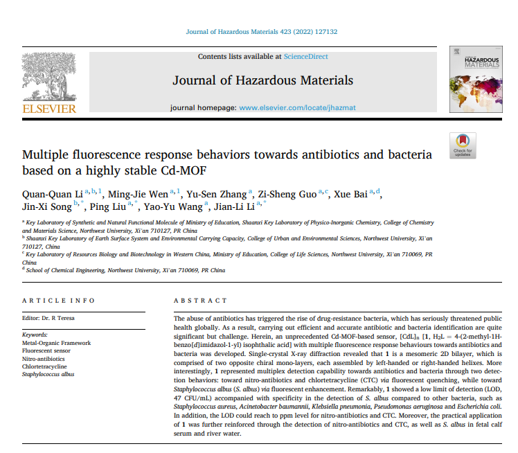 【论文题目】Multiple fluorescence response behaviors towards antibiotics and bacteria based on a highly stable Cd-MOF