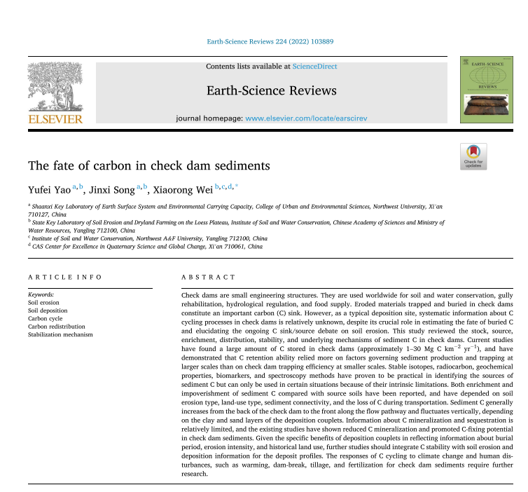 淤地坝是小型工程结构,它们在世界范围内用于水土保持、沟壑恢复、水文调节和粮食供应。被截留和掩埋在淤地坝中的侵蚀物质构成了一个重要的碳汇。然而,作为一个典型的沉积场地,尽管淤地坝在研究埋藏碳的循环过程和阐明正在进行的土壤侵蚀碳库/源争论中起着至关重要的作用,但关于淤地坝碳循环过程的系统信息相对来说知之甚少。本研究综述了淤地坝沉积泥沙碳的储量、来源、富集、分布、稳定性及其潜在机制。目前的研究发现,在淤地坝中储存了大量的碳(约1–30 Mg C km-2 yr-1),在较大尺度碳的滞留能力更多地依赖于影响沉积泥沙产生的因素和淤地坝的拦截效率,在较小尺度更多依赖于淤地坝拦截效率。稳定同位素、放射性碳、地球化学性质、生物标志物和光谱学方法已被证明在确定沉积泥沙碳的来源方面是可行的,但由于其固有的局限性只能在某些情况下使用。与来源土壤相比,沉积泥沙碳的富集和贫化都已被报道,这取决于土壤侵蚀类型、土地利用类型、沉积泥沙连通性和运输过程中碳的损失。沉积泥沙碳通常沿水流路径从拦河坝后部到前部增加,并垂直波动,这取决于沉积泥沙粘土层和砂层的分布。关于碳矿化和固碳的信息相对有限,现有研究表明,淤地坝沉积泥沙中的碳矿化降低,并促进碳固定潜力。鉴于沉积旋回在反映埋藏期、侵蚀强度和历史土地利用信息方面的特殊优势,进一步的研究应整合沉积泥沙剖面的碳稳定性以及土壤侵蚀和沉积信息。淤地坝沉积泥沙碳循环对气候变化和人为干扰(如变暖、溃坝、耕作和施肥)的响应,需要进一步研究。