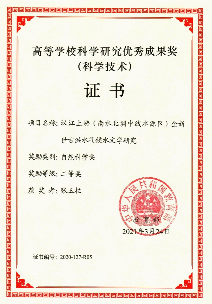 近日,教育部公布《教育部关于2020年度高等学校科学研究优秀成果(科学技术)奖励的决定(教科信[2021]1号)》,其中省重实验室的张玉柱副教授参与完成的“汉江上游(南水北调中线水源区)全新世古洪水气候文学研究”成果荣获自然科学奖二等奖。张玉柱副教授作为项目骨干成员,参与并完成其中野外考察观测、实验室测试分析和测年断代数据分析等基础工作。