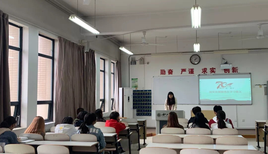 团支书以“我与祖国共奋进”主题微团课为活动开篇,让同学们认识到学习国史的重要意义:历史是最好的教科书,“无限的过去都以现在为归宿,无限的未来都以现在为渊源”,回望新中国70年不平凡的历程,我们能得到许多宝贵的历史启示。