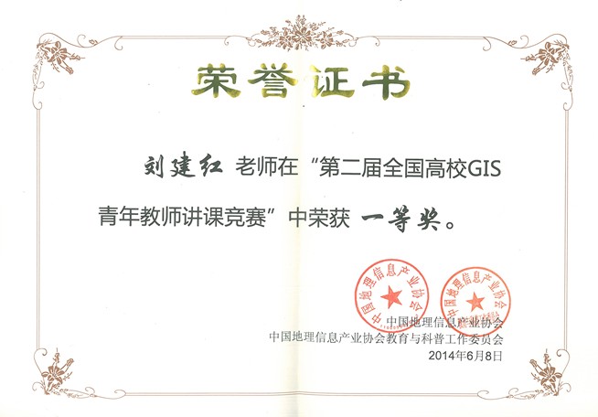 为了强化GIS教学经验交流、提高青年教师教学水平,由中国地理信息产业协会和中国 GIS 协会教育与科普工作委员会主办、清华大学承办的“第二届全国高校GIS青年教师讲课竞赛”于6月6-8号召开,澳门pg青年教师刘建红博士荣获一等奖。
