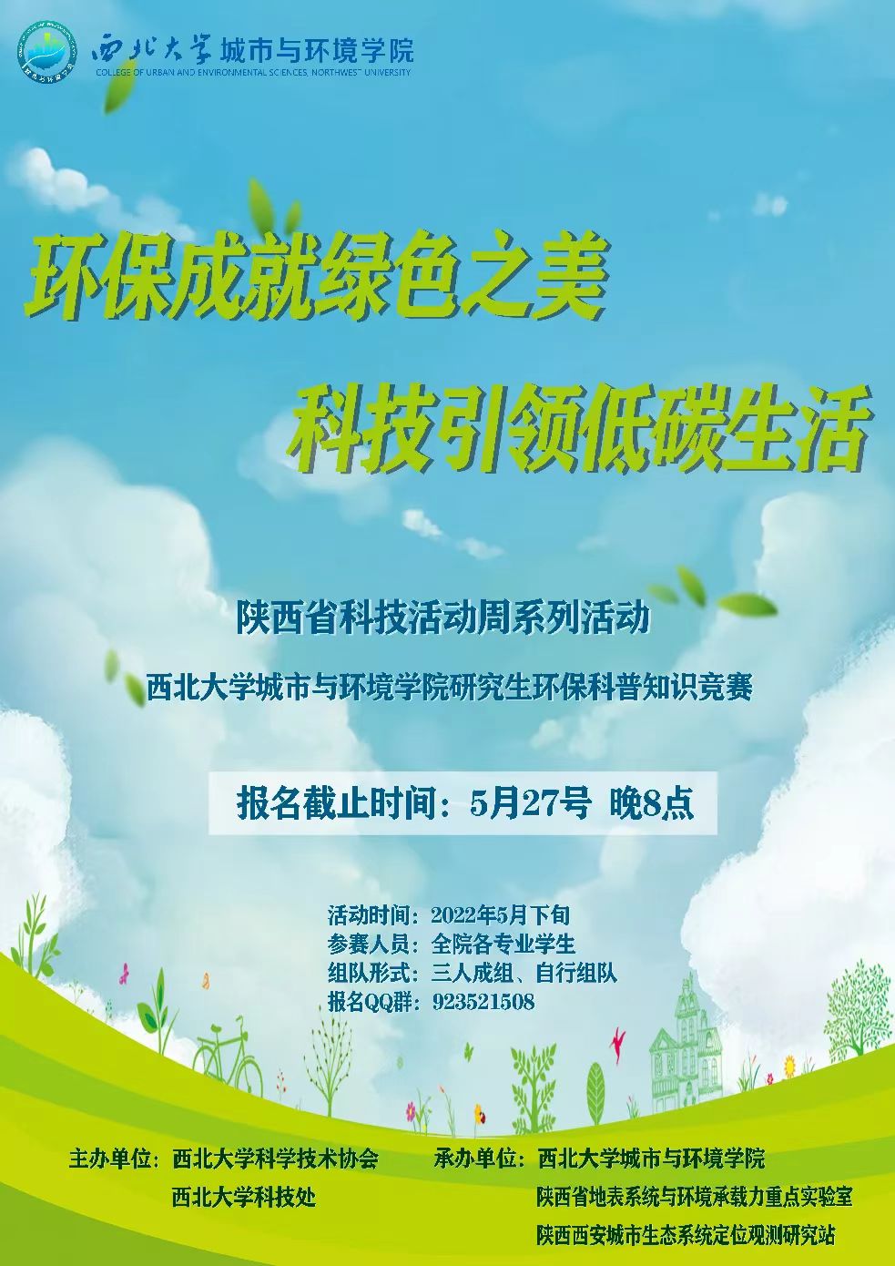 为进一步弘扬科学精神,普及科学知识,加快提升公民科学文化素质,为新时代全面深入实施创新驱动发展战略、加快建设世界科技强国营造良好文化氛围,根据陕西省科学技术厅、中共陕西省委宣传部、陕西省科学技术协会、澳门pg官方电子平台科学技术协会《关于举办2022年陕西省科技活动周》(陕科办发〔2022〕42号)的通知要求,澳门pg官方电子平台、陕西省地表系统与环境承载力重点实验室、陕西西安城市生态系统定位观测研究站共同组织了“环保成就绿色之美、科技引领低碳生活”环保科普知识竞赛。该竞赛分为初赛和决赛两个阶段,初赛时间为5月28日9:00-20:00,决赛于6月2日在澳门pg官方电子平台516多媒体教室举行。