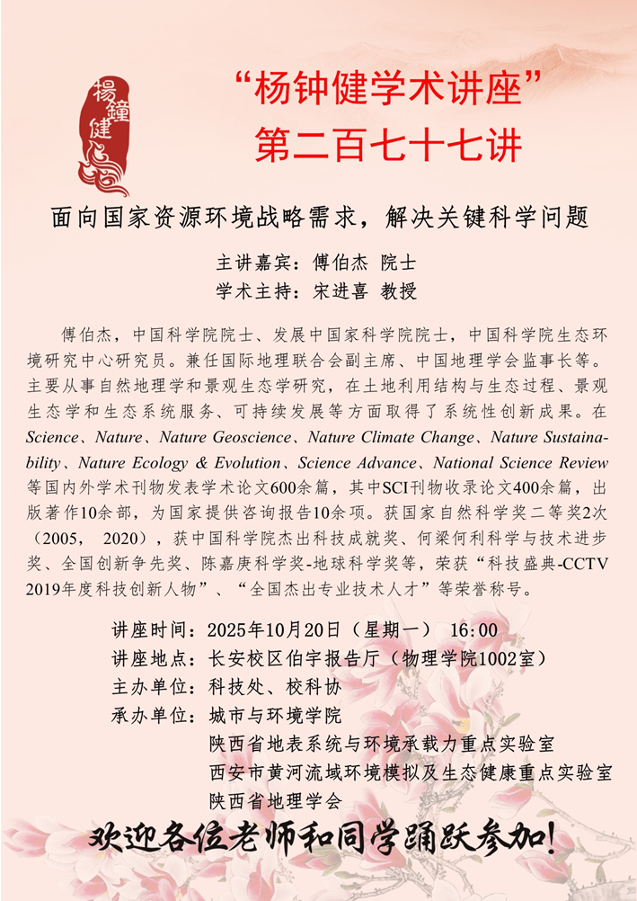 2025年10月20(星期一)下午16:00,由澳门pg科技处、校科协主办,澳门pg官方电子平台、陕西省地表系统与环境承载力重点实验室、西安市黄河流域环境模拟及生态健康重点实验室、陕西省地理学会承办的“杨钟健学术讲座”第二百七十七讲在长安校区物理学院伯宇报告厅举行。中国科学院院士、发展中国家科学院院士、中国科学院生态环境研究中心傅伯杰研究员应邀作了题为“面向国家资源环境战略需求,解决关键科学问题”的学术报告。本次学术讲座由宋进喜教授主持,澳门pg师生积极参与。