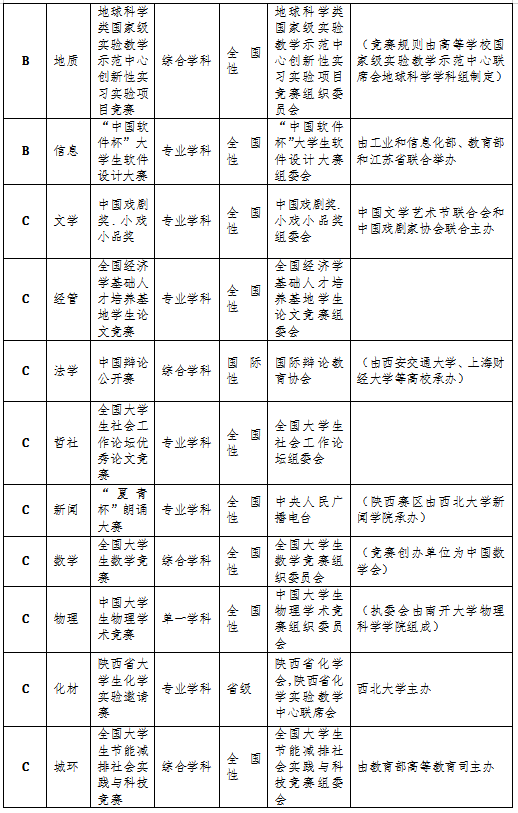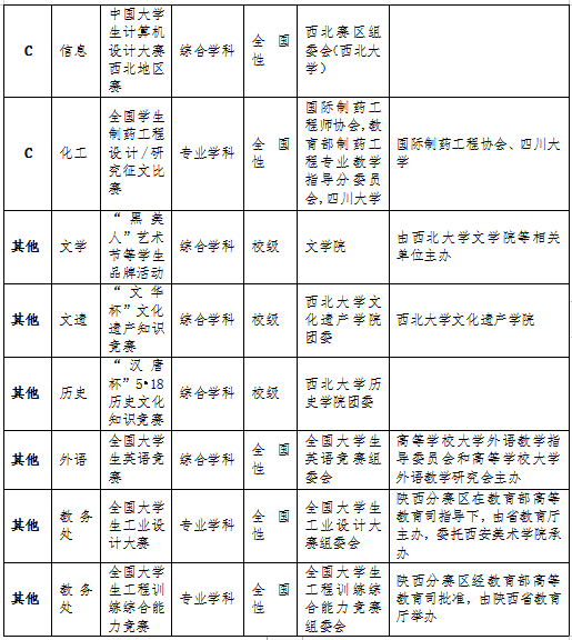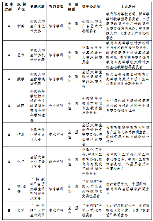 (二)学生参加学科竞赛,依照《澳门pg官方电子平台本科实践教学经费分配办法》(西大教〔2013〕22号)、《澳门pg官方电子平台关于新增本科生学生竞赛“推动计划”立项项目及对相关项目进行调整的通知》(西大教〔2015〕5号)文件中立项竞赛类别,对参加澳门pg官方电子平台本科生学科竞赛“推动计划”立项竞赛者获奖者加分,加分标准如下: