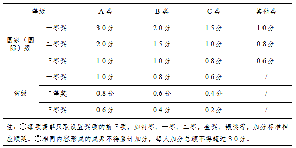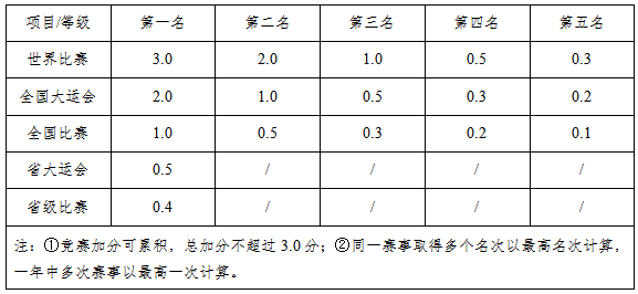 (三)学生获世界大学生运动会、全国大学生运动会前5名以及省级大学生运动会第1名等,加分标准如下: