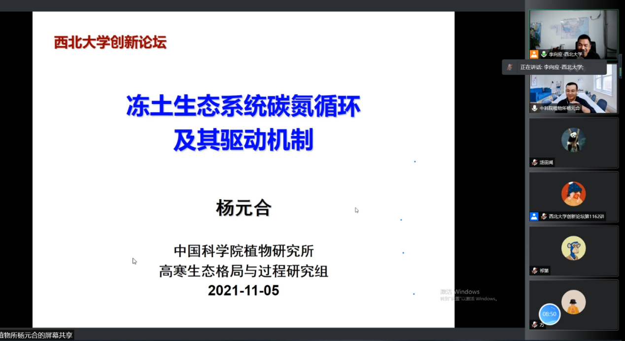 2021年11月5日上午,由澳门pg科技处、科协主办,澳门pg官方电子平台、陕西省地表系统与环境承载力重点实验室承办的“澳门pg官方电子平台创新论坛”第一千零一百六十二讲暨“澳门pg官方电子平台120周年校庆年”系列活动在澳门pg官方电子平台三楼学术报告厅举行。中国科学院植物研究所研究员杨元合应邀为实验室人员作了题为《冻土生态系统碳氮循环及其驱动机制》的报告。学校相关研究人员和学生350余人积极参加了本次报告会,报告由李向应教授主持。