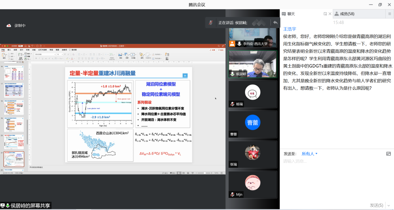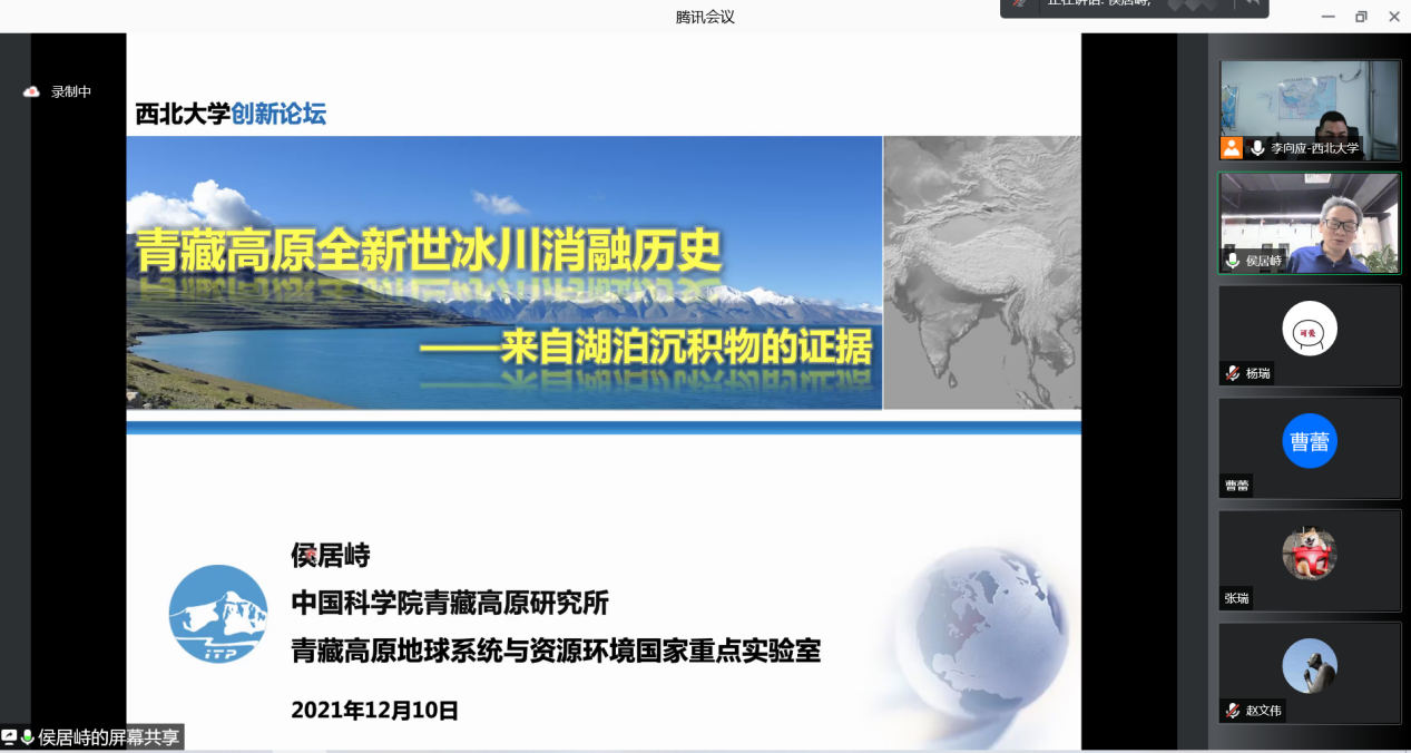 2021年12月10日星期五下午,由澳门pg科技处、科协主办,澳门pg官方电子平台、陕西省地表系统与环境承载力重点实验室承办的“澳门pg官方电子平台创新论坛”第一千零一百九十讲暨“澳门pg官方电子平台120周年校庆年”系列活动在在腾讯会议线上举行。中科院青藏高原研究所研究员侯居峙应邀为相关研究人员作了题为“青藏高原全新世冰川消融历史—来自湖泊沉积物的证据”的报告。学校相关研究人员和学生积极参加了本次报告会,报告由李向应教授主持。