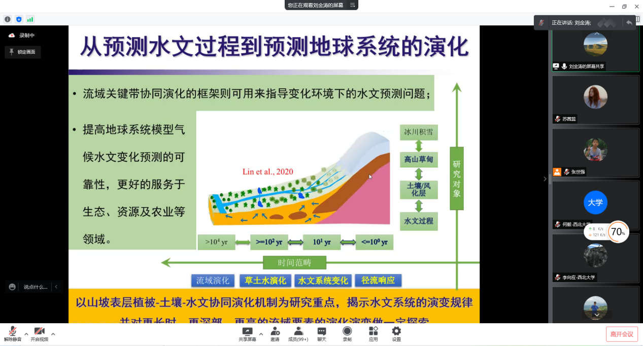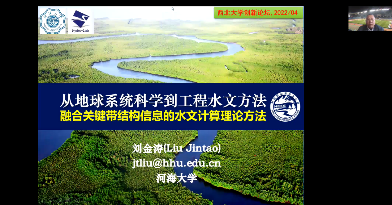 2022年4月1日星期五下午,由澳门pg科技处、科协主办,澳门pg官方电子平台、陕西省地表系统与环境承载力重点实验室承办的“澳门pg官方电子平台创新论坛”第一千零一百九十六讲暨“澳门pg官方电子平台120周年校庆年”系列活动在在腾讯会议线上举行。河海大学刘金涛教授应邀为相关研究人员作了题为“从地球系统科学到工程水文方法——融合关键带结构信息的水文计算理论方法”的报告。学校相关120余位研究人员和学生参加了本次报告会,报告由张世强教授主持。