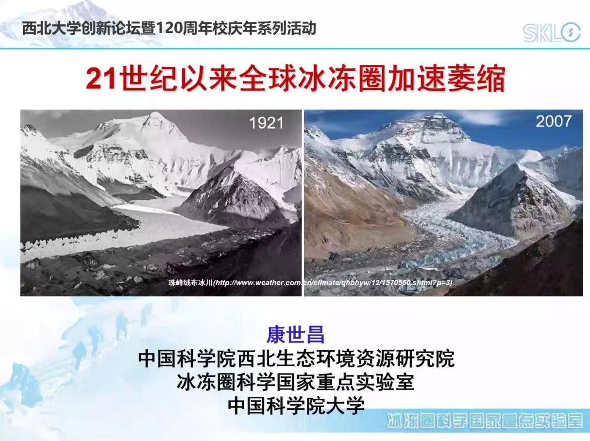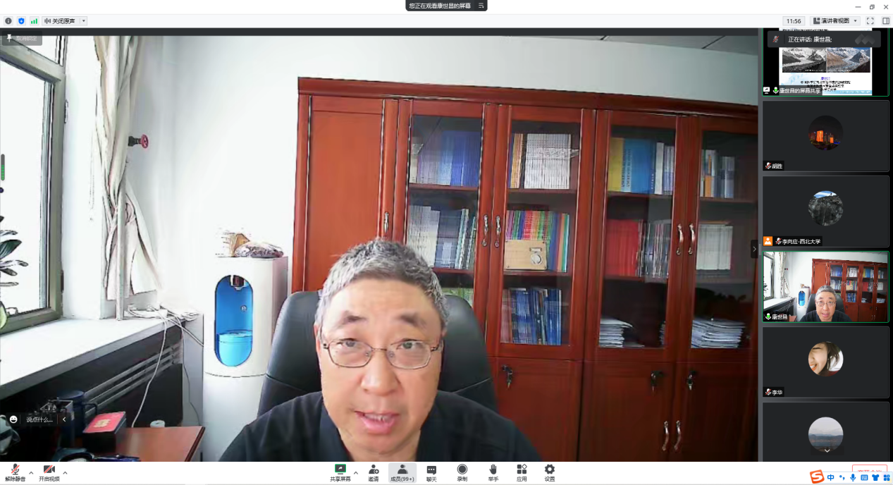 2022年9月16日(星期五)下午,由澳门pg科技处、科协主办,澳门pg官方电子平台、陕西省地表系统与环境承载力重点实验室承办的“澳门pg官方电子平台创新论坛”第一千二百七十六讲暨“澳门pg官方电子平台120周年校庆年”系列活动在腾讯会议线上举行。中国科学院西北生态环境资源研究院副院长康世昌研究员应邀为相关研究人员作了题为“21世纪以来全球冰冻圈加速萎缩”的报告。校内外110余位相关研究人员和学生参加了本次报告会,报告由李向应教授主持。