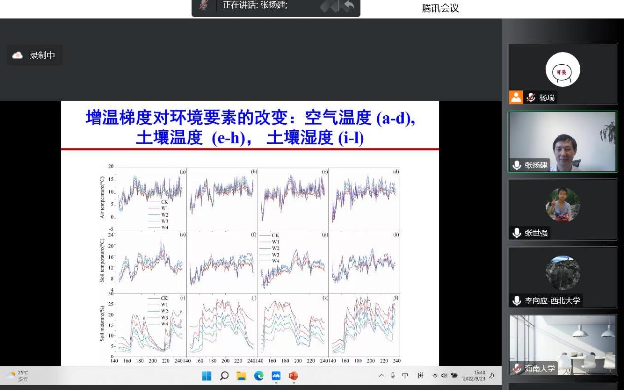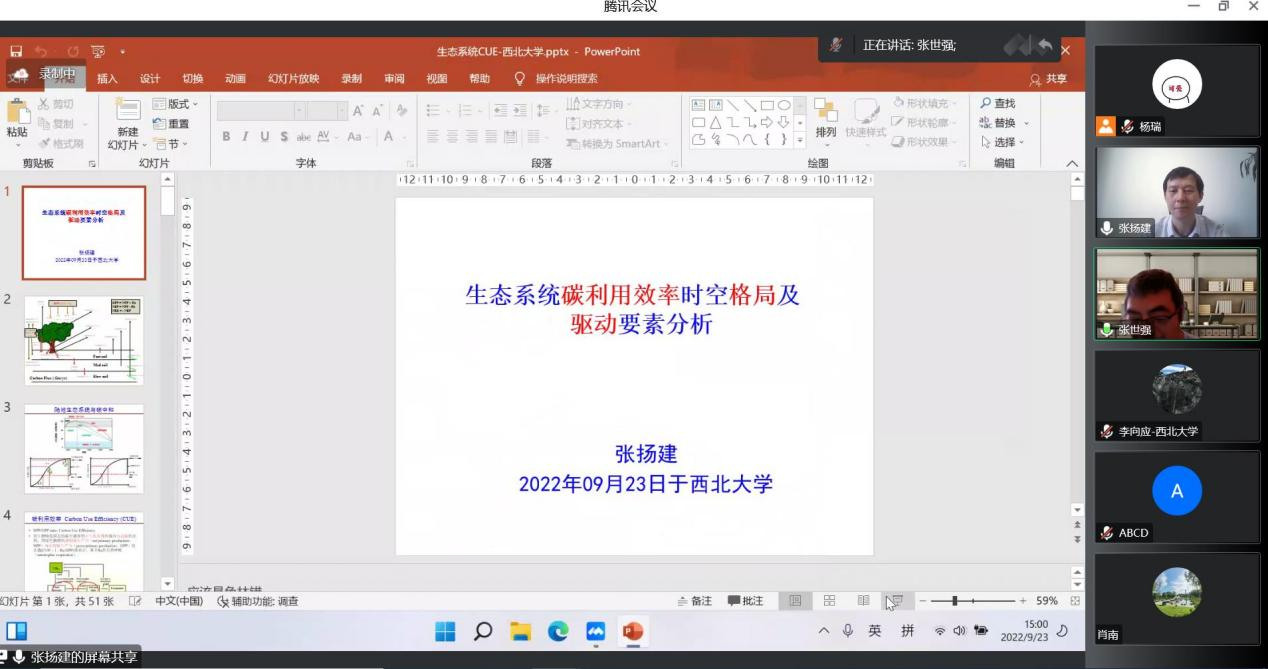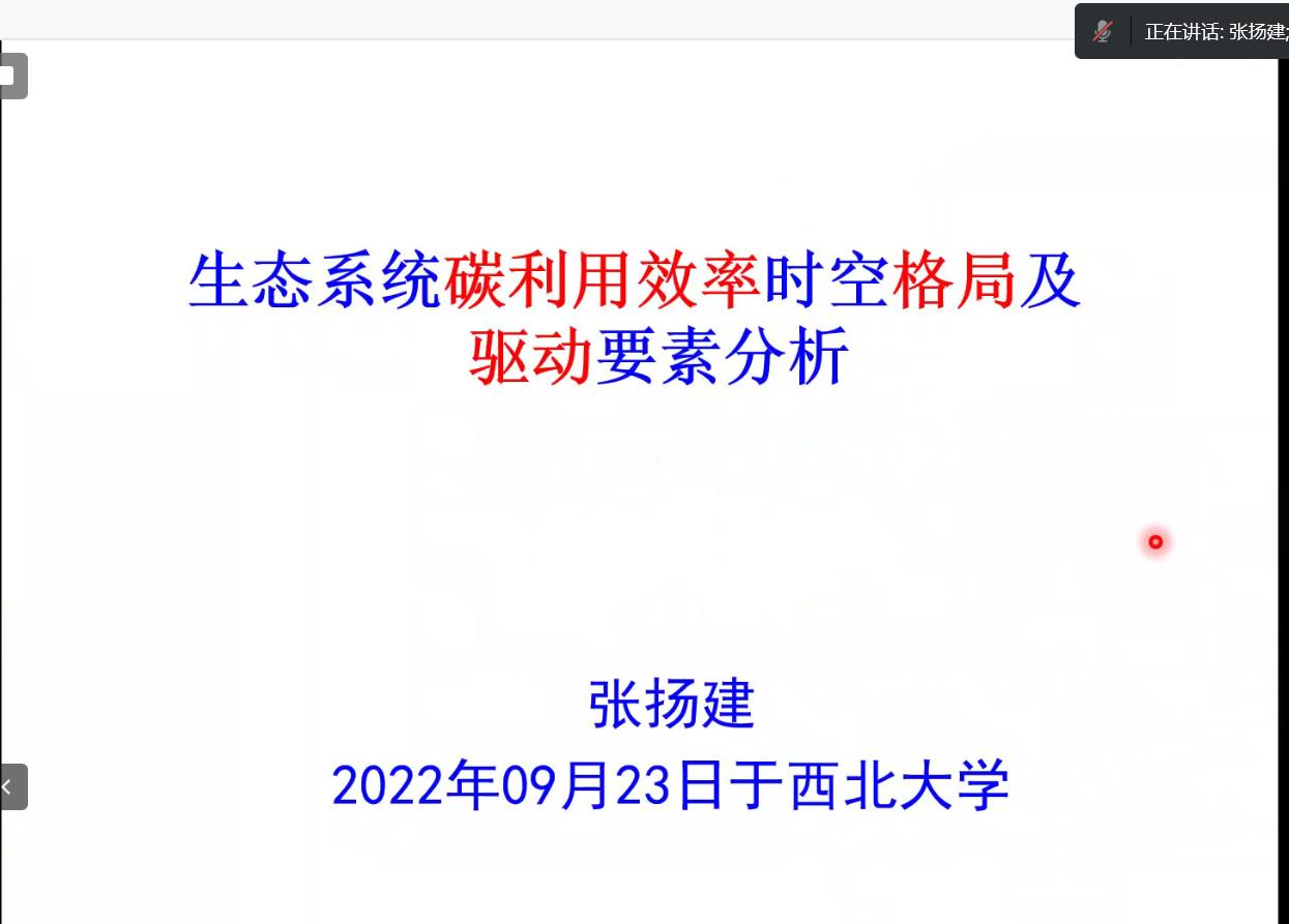 2022年9月23日(星期五)下午,由澳门pg科技处、科协主办,澳门pg官方电子平台、陕西省地表系统与环境承载力重点实验室承办的“澳门pg官方电子平台创新论坛”第一千二百八十六讲暨“澳门pg官方电子平台120周年校庆年”系列活动在腾讯会议线上举行。中国科学院地理资源所张扬建研究员应邀为相关研究人员作了题为“生态系统碳利用效率时空格局及驱动要素”的报告。校内外90余位相关研究人员和学生参加了本次报告会,报告由张世强教授主持。