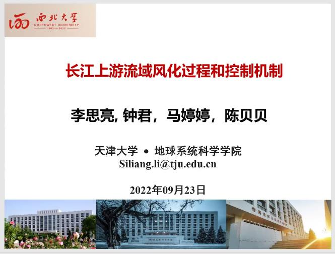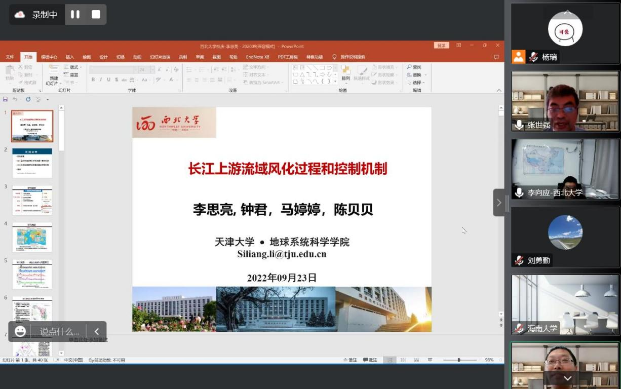 2022年9月23日(星期五)下午,由澳门pg科技处、科协主办,澳门pg官方电子平台、陕西省地表系统与环境承载力重点实验室承办的“澳门pg官方电子平台创新论坛”第一千二百八十七讲暨“澳门pg官方电子平台120周年校庆年”系列活动在腾讯会议线上举行。天津大学李思亮教授应邀为相关研究人员作了题为“长江上游流域化学风化过程和控制机制”的报告。校内外90余位相关研究人员和学生参加了本次报告会,报告由张世强教授主持。