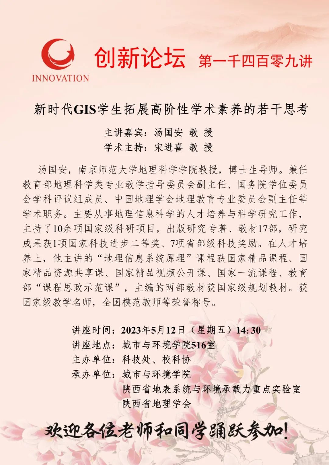 2023年5月12日(星期五)下午三点,由澳门pg科技处、校科协主办,澳门pg官方电子平台、陕西省地表系统与环境承载力重点实验室和陕西省地理学会承办的澳门pg官方电子平台“创新论坛”第一千四百零九讲在澳门pg官方电子平台长安校区澳门pg官方电子平台516会议室举行。南京师范大学地理科学学院教授兼任教育部地理科学类专业教学指导委员会副主任汤国安教授应邀为相关研究人员和学生作了题为“新时代GIS学生拓展高阶性学术素养的若干思考”的报告。本次讲座由宋进喜教授主持,澳门pg学生积极参与。