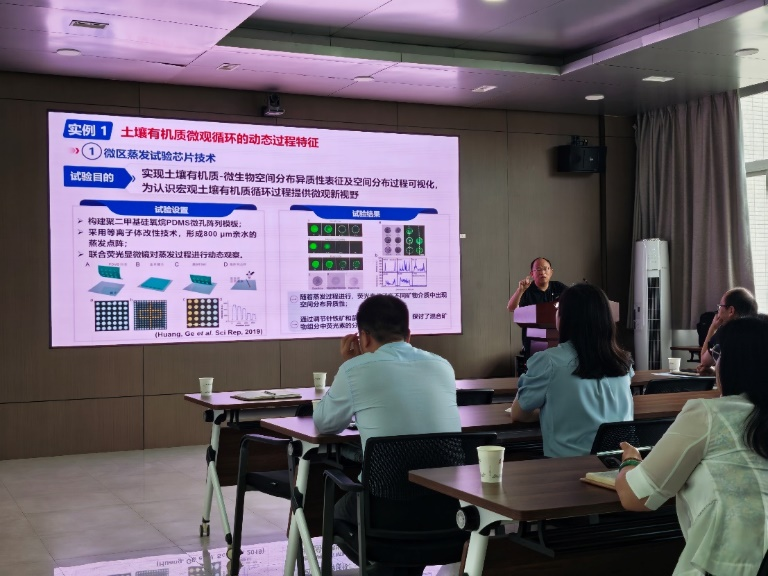 在会议报告上,葛体达研究员首先介绍了农产品质量安全全国重点实验室的定位与研究背景,该实验室聚焦农产品质量安全全链条,以土壤健康为源头,通过三大方向与九大任务实现农产品质量管控。葛体达研究率领的研究团队以土壤为研究对象,运用同位素标记、微生物分子生物学等方法,探索微生物生态功能与健康的关联,致力于土壤修复与环境耦合研究。其次,葛体达研究员重点阐述了当前碳氮循环与微生物研究的新方法与技术,包括借助微流控技术构建土壤芯片,模拟水稻淹水等生态情境,动态研究土壤有机质形成等生态过程;利用酶活性成像等原位可视化技术,呈现土壤指标二维分布,追踪光合产物分布以深化碳循环理解;利用稳定同位素标记探针技术,可开展光合产物输入去向和微生物响应研究;利用DNA-SIP、磁性纳米颗粒分离、纳米二次离子质谱、单细胞拉曼等前沿技术,可分别在识别碳过程相关微生物、分离活性微生物、分析碳-细胞空间关系、挖掘未培养微生物功能方面发挥关键作用。这些技术从多尺度深化了对碳氮循环过程的理解。最后,葛体达研究员指出了当前土壤碳循环相关研究的挑战与未来方向,指出部分技术成本高昂限制应用,土壤生态系统复杂性需更深入研究。未来应优化技术降低成本,加强多技术结合与交叉学科研究,从多尺度探究碳氮循环与微生物关系,强化应用导向服务农业生产与环境保护。